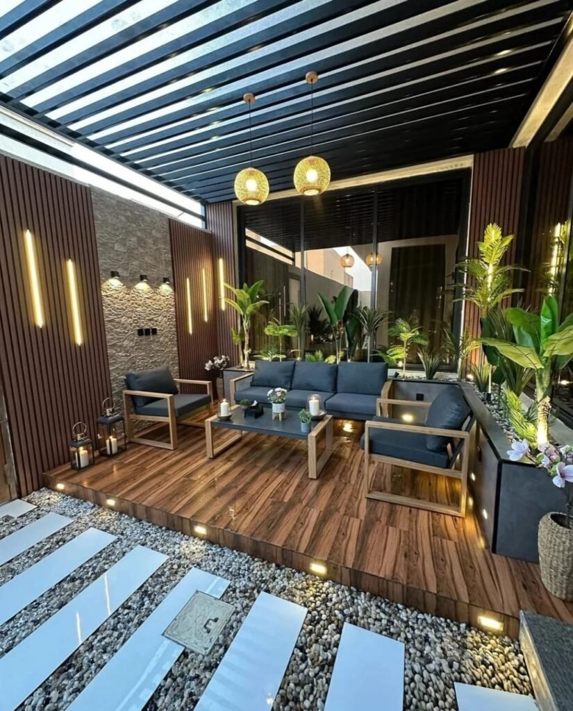 - تصميم وتنفيذ الإضاءة الخارجية والجلسات الخارجية.
